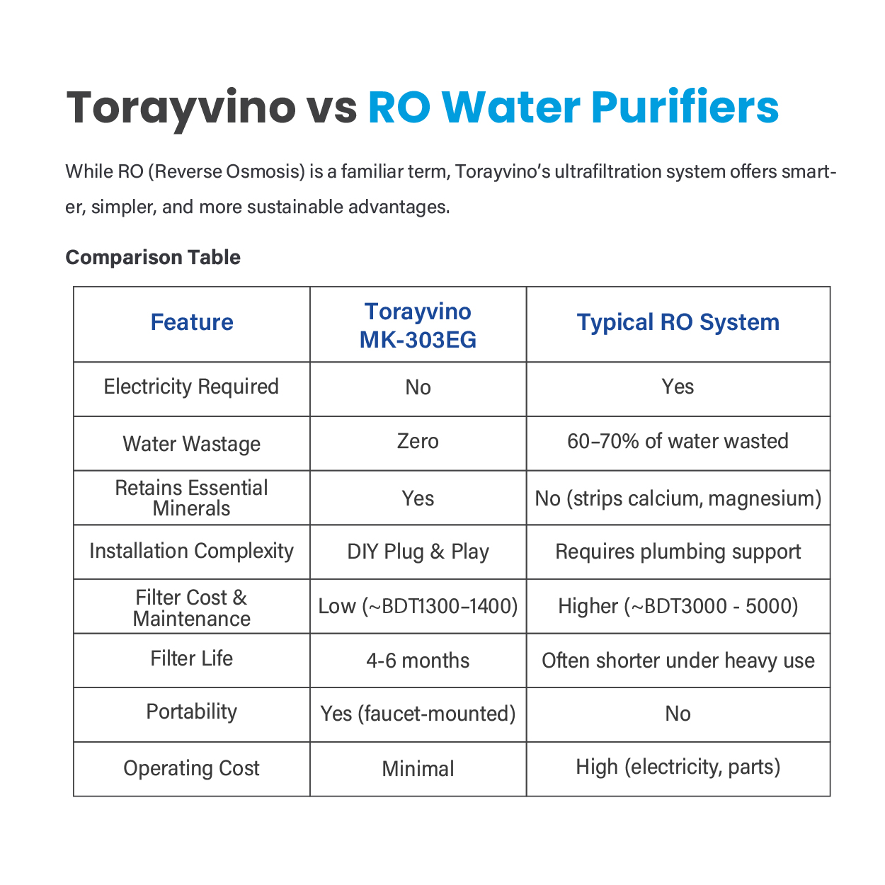 Torayvino হল জাপানের বিশ্ববিখ্যাত প্রযুক্তি প্রতিষ্ঠান Toray Industries Ltd. এর তৈরি একটি প্রিমিয়াম ওয়াটার পিউরিফায়ার। এটি ১৯৮৬ সাল থেকে বিশুদ্ধ ও স্বাস্থ্যকর পানির প্রযুক্তি উন্নয়নে কাজ করে যাচ্ছে। Torayvino-তে ব্যবহৃত ৪-স্তরের পরিশোধন প্রযুক্তি পানি থেকে ব্যাকটেরিয়া, ভাইরাস, ক্লোরিন, দুর্গন্ধ ও ক্ষতিকর কেমিক্যাল দূর করে, এবং প্রয়োজনীয় মিনারেল (যেমন: ক্যালসিয়াম, পটাশিয়াম ও ম্যাগনেশিয়াম) বজায় রাখে।